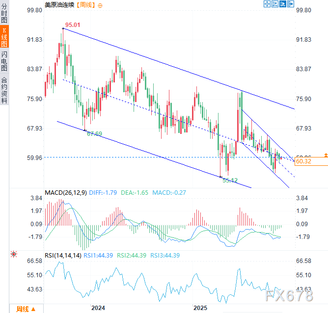 油价目前在三年的下跌趋势通道中区和五个月通道中区附近徘徊,成为市场应对2026年供应不确定性和劳动力市场风险时的关键短期与长期参考点位。