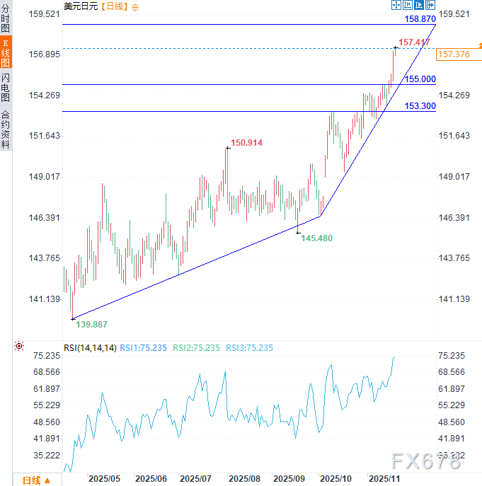 汇通财经APP讯——周四(11月20日)美元兑日元一度上涨0.18%,刷新逾十个月高点达157.42,延续前三个交易日涨势。前一交易日美元兑日元录得约1.08%的涨幅,收报157.13,超越过去五个交易日的平均水平。这反映出日元短期持续疲软,而美元仍保持强劲势头。近日持续积累的买盘压力在隔夜美联储会议纪要公布后进一步增强,暗示12月利率决策可能采取中性立场。这一转变使日元相较于美元的吸引力下降,或将在后续交易中延续美元/日元的看涨倾向。
