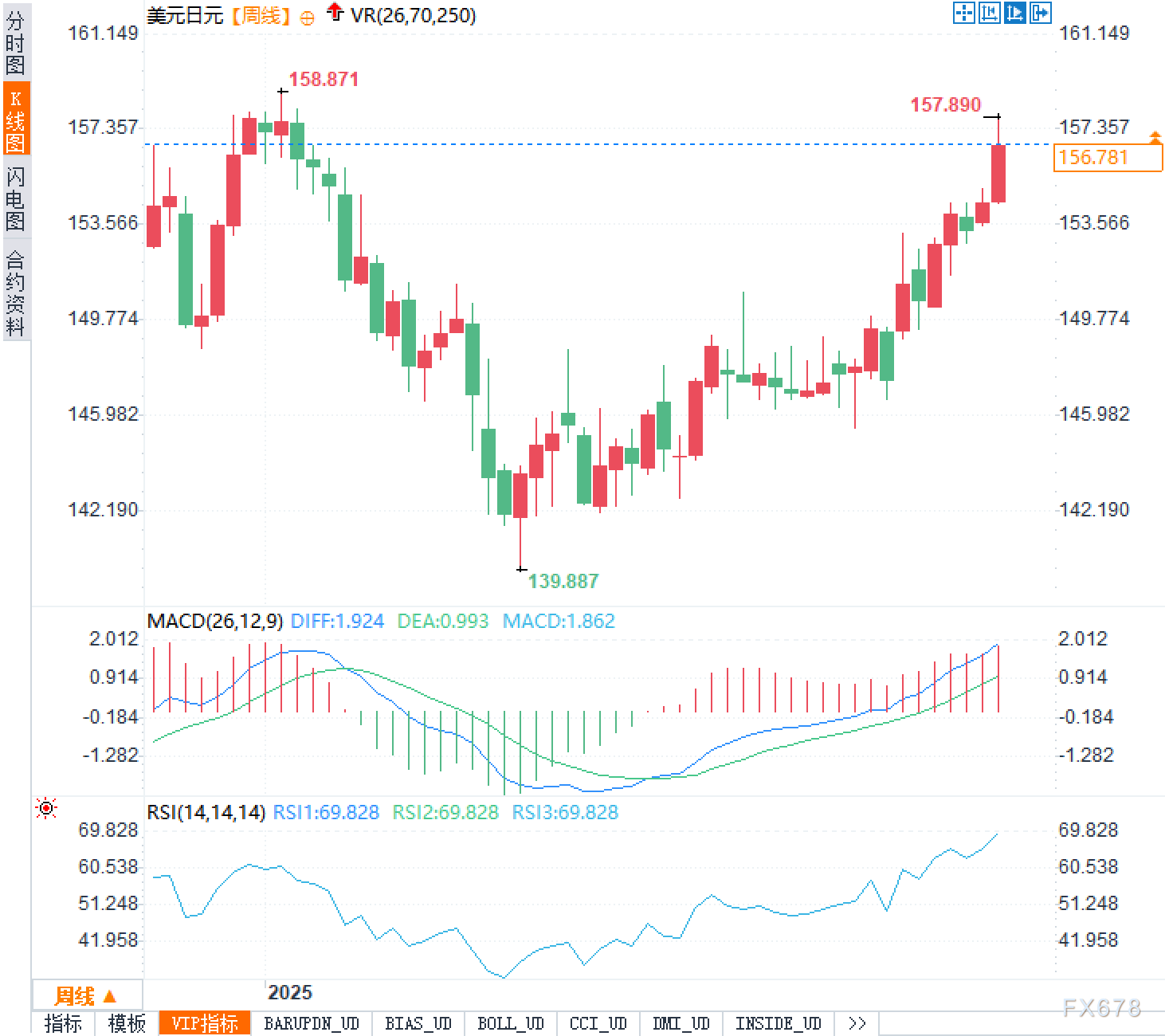 随着财政刺激推高债务预期、压低本币吸引力,日元贬值压力再度加剧。当前美元兑日元已接近158关口,距离2025年高点158.871仅一步之遥。一旦突破并逼近160这一关键心理位,日本当局实施外汇干预的可能性将显著上升。