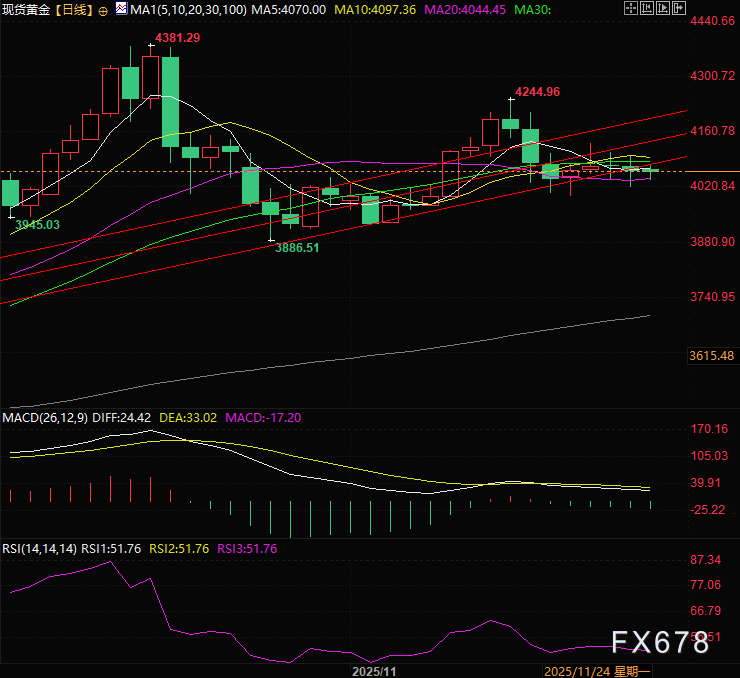 金价方面,金价对地缘紧张敏感,若和平谈判取得实质进展,避险需求降温可能使金价承压,近期的走势显示了和谈对金价的压制,金价跌穿上升通道,显示弱势振荡可能向下发展。